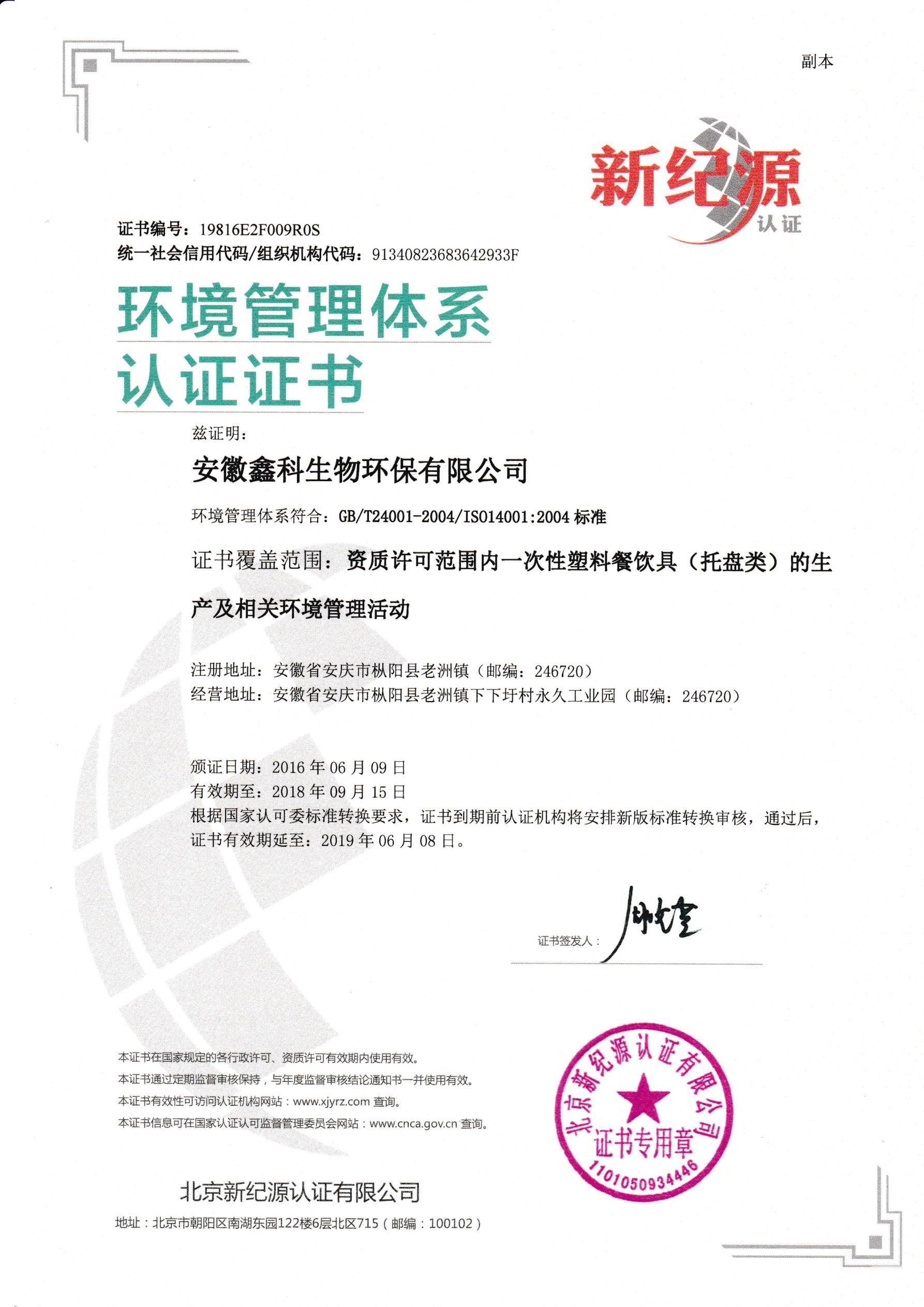 環(huán)境管理體系認(rèn)證證書(shū)